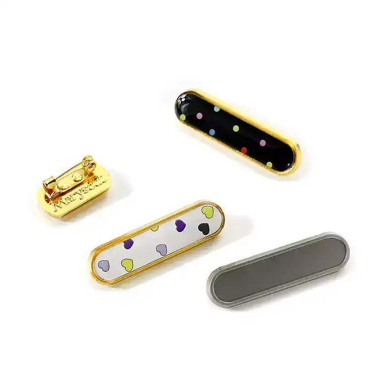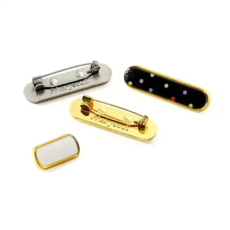 Rechteckige Metallnadel aus Epoxidharz, wir haben fertige Formen mit anpassbaren Logos in der Mitte. Die Oberfläche ist mit Epoxidharz beschichtet, das glänzend ist und das Produkt effektiv schützen kann. Die Rückseite ist mit Sicherheitsnadeln ausgestattet, die nicht leicht abfallen und in mehreren Farben zur Auswahl stehen