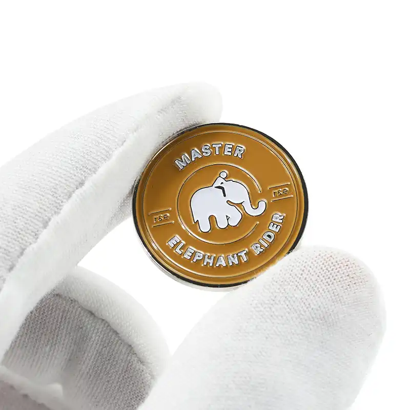 Spilla circolare personalizzata a forma di elefante, con un simpatico logo di elefante sul davanti e colorazione a smalto. Il distintivo ha una lucentezza metallica e linee metalliche che lo rendono un oggetto di squisito artigianato.