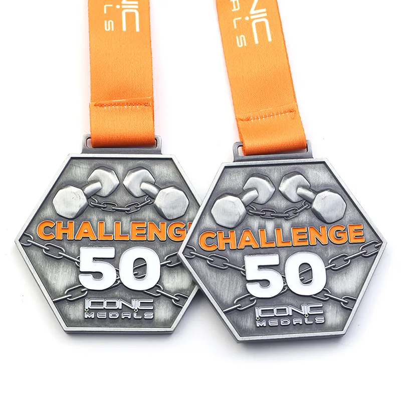 La medaglia esagonale in argento antico con numero 50 e manubrio per il sollevamento pesi è un premio unico e accattivante. Realizzata in forma esagonale con finitura in argento antico, presenta il numero "50" e il disegno di un manubrio, simbolo di forza e di successo. Questa medaglia, realizzata su misura con materiali di alta qualità, è perfetta per onorare i successi nel sollevamento pesi.