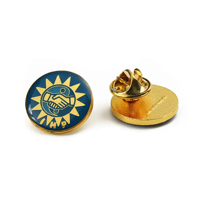 This circular badge with 3D relief and baked enamel epoxy resin features a deep blue baked enamel base, paired with eye – catching golden 3D relief patterns. The handshake pattern and the sun – ray design at the center convey the meanings of cooperation and hope, while the “JHP” lettering at the bottom adds a sense of exclusive identity. The epoxy resin process on the surface endows the patterns with a greater sense of luster and three – dimensionality, and the golden edging on the rim is delicate. Equipped with a butterfly clasp, it can be firmly attached to clothes or backpacks. It is an exquisite accessory that combines commemorative value and decorative appeal.