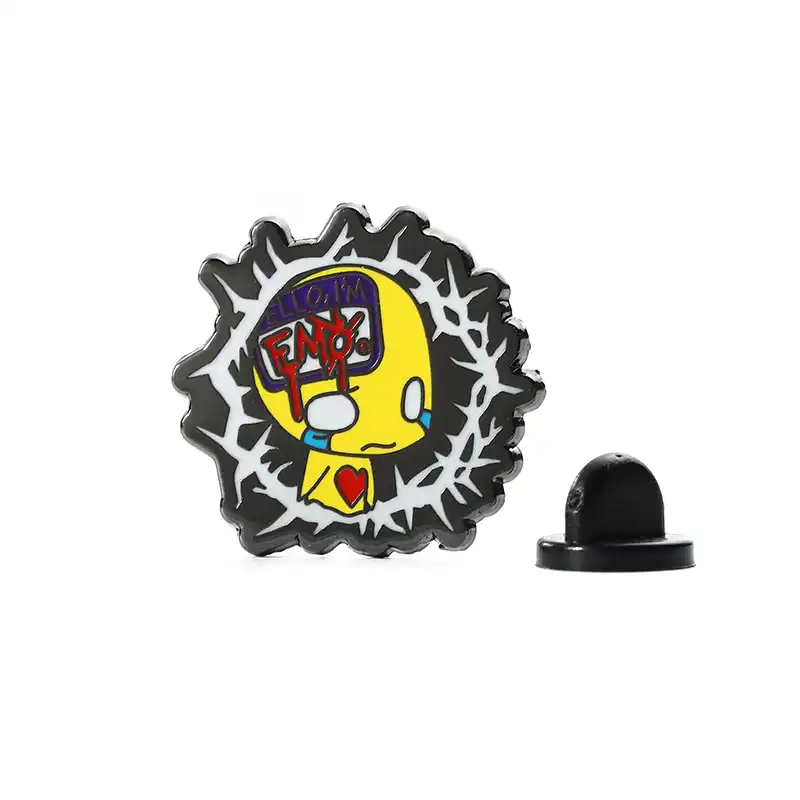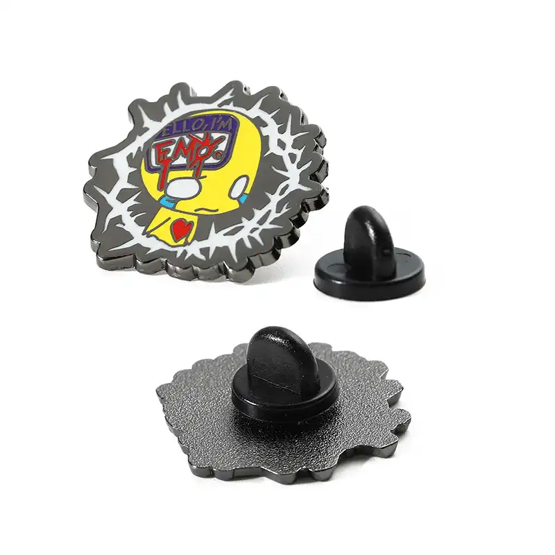 O contorno externo tem formato irregular, é feito de material de liga de zinco e a superfície é decorada com tecnologia de esmalte macio, embelezada com cores brilhantes. O logotipo interno é um pequeno personagem amarelo, trazendo uma estética de design exclusiva. A parte traseira é fixada com uma fivela de borracha.